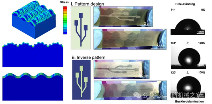 系统性地研究了薄膜基底层合结构表面起皱和层间开裂的力学原理,并以此为基础开发屈曲驱动的可重构多功能微纳表面,包括极端拉伸性、超疏水性、低光学透明度、可控粘附等。